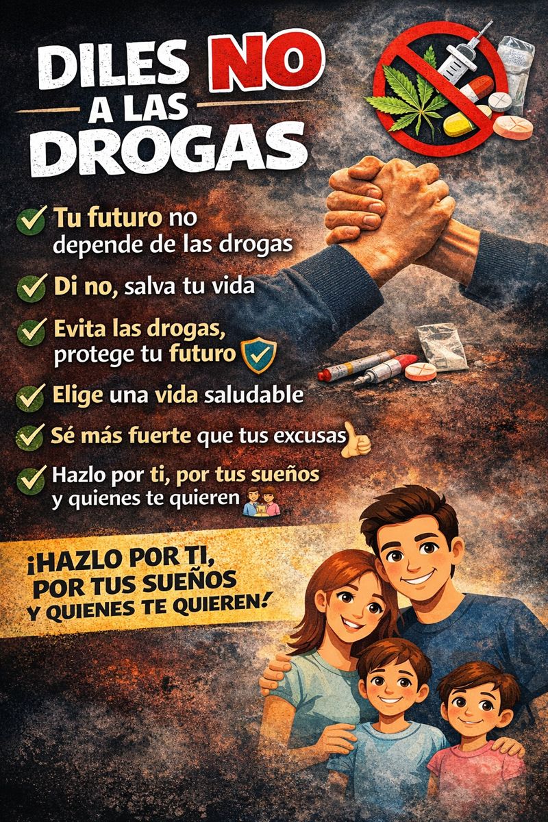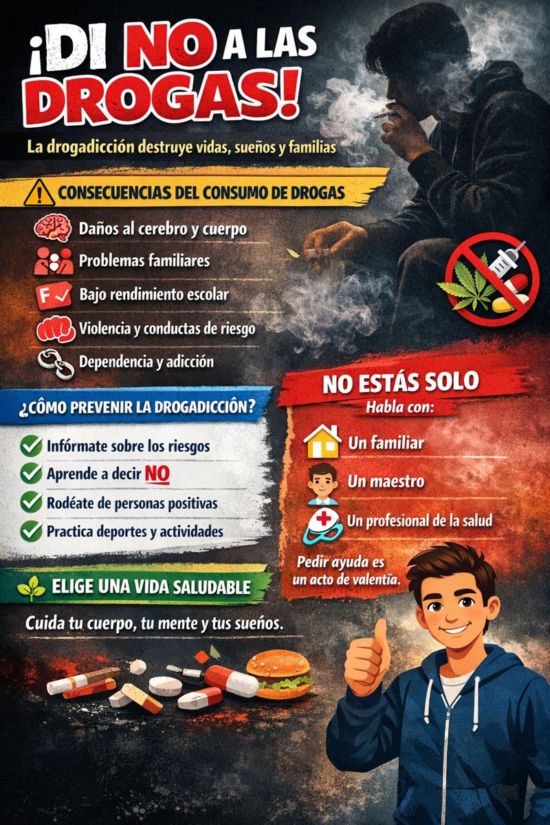 Las adicciones representan uno de los problemas más serios que afectan a la salud y al bienestar de las personas, especialmente en niños, adolescentes y jóvenes. El consumo de sustancias nocivas no solo daña el cuerpo, sino que también afecta la mente, las relaciones familiares y el desempeño escolar y social. Muchas veces, el inicio de una adicción ocurre por curiosidad, presión social o falta de información. Por ello, la prevención de las adicciones es fundamental, ya que permite crear conciencia sobre los riesgos y fortalecer la toma de decisiones responsables. Informar, orientar y fomentar valores como el autocuidado, el respeto y la autoestima ayuda a que las personas puedan decir “no” a las drogas y elegir un estilo de vida saludable.